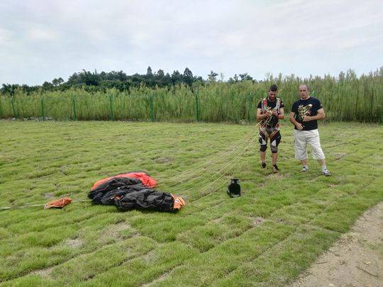 “快看!跳伞了!”飞机在空中不断往来盘旋,大约三四十分钟后,飞机后部出现了两个黑影,现场一片欢呼。仅仅过了几分钟,四名跳伞队员陆续降落到地面。“跳伞的天气条件,只要云高有1500米,就可以进行跳伞运动。从飞机起飞到跳伞队员降落到地面,大约1小时的时间。”