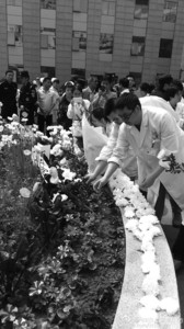 4月1日中午,四川省人民医院各科室医务人员自发到医院花园里为周晓辉医生献花,寄托哀思。 资料图片