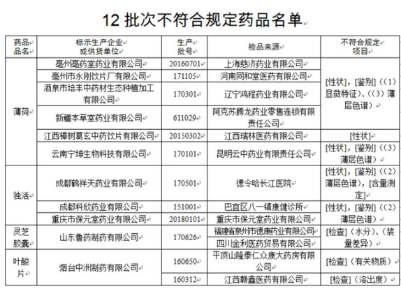 经山西省食品药品检验所检验,标示为亳州亳药堂药业有限公司、亳州市永刚饮片厂有限公司、江西樟树葛玄中药饮片有限公司、云南宁坤生物科技有限公司、酒泉市培丰中药材生态种植加工有限公司、新疆本草堂药业有限公司生产的6批次薄荷不符合规定,不符合规定项目包括性状、显微特征、薄层色谱。