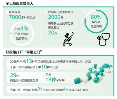 目前,在我国上市且有罕见病适应证的55种药物中,有29种药物纳入国家医保目录,涉及18种罕见病,其中9种药物享受国家医保目录甲类报销,患者使用时无需自付费用。今年3月,我国对首批21个罕见病药品和4个原料药实行减税。降低3%的增值税,同步降低药品价格。一系列利好政策,为罕见病患者打开“希望之门”。(王君平)