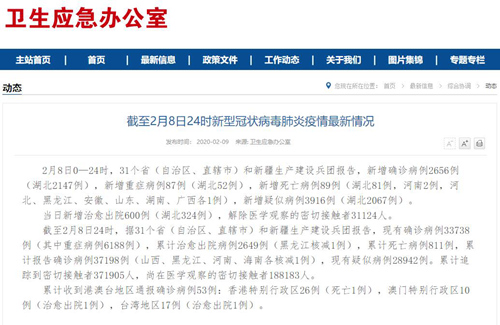 人民网北京2月9日电(董童)国家卫生健康委于9日在官网发布的《截至2月8日24时新型冠状病毒肺炎疫情最新情况》(以下简称“情况”)称,2月8日0—24时,31个省(自治区、直辖市)和新疆生产建设兵团报告,新增确诊病例2656例(湖北2147例),新增重症病例87例(湖北52例),新增死亡病例89例(湖北81例,河南2例,河北、黑龙江、安徽、山东、湖南、广西各1例),新增疑似病例3916例(湖北2067例)。当日新增治愈出院600例(湖北324例),解除医学观察的密切接触者31124人。
