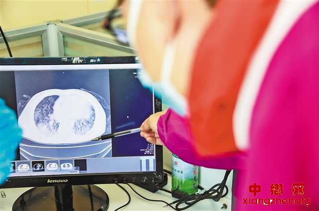 刘景仑在孝感市孝昌县第一人民医院和医生们分析患者医学影像(2月21日摄)。