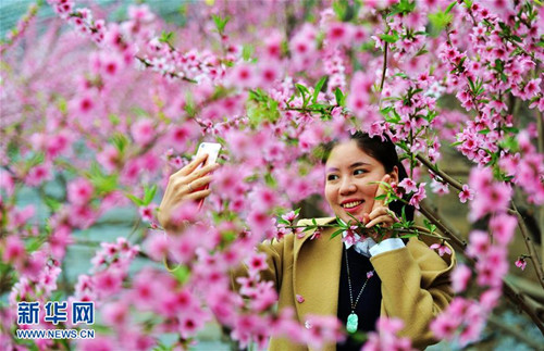 2月21日,游客在藁城区生态农业观光园里自拍。近年来,河北省石家庄市藁城区在推进产业富民过程中,以设施农业资源为依托,推进现代休闲观光农业和乡村旅游融合发展。目前,藁城区已建成各类生态休闲观光农业园区30余家,带动周边农户致富增收。新华社记者 王晓 摄