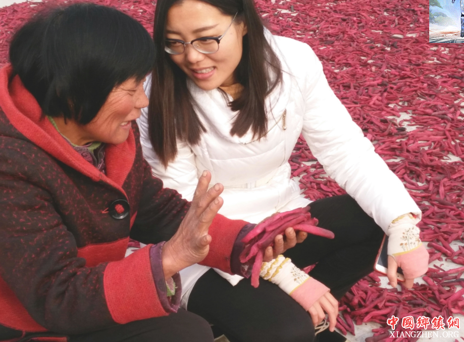 12月11日,山东省郯城县马头镇工作人员在联系户杨申明家的平房顶上,正耐心地听她介绍“红萝卜干”助长她“红火事业”的经历。瞧,杨申明兴奋地打出了手势:这一斤红咸萝卜干可卖五元钱。今年又腌了20000斤红萝卜,估计至少也能赚20000元。