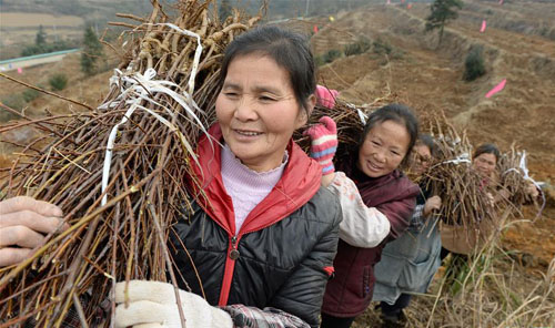 2月11日,在贵阳市乌当区百宜镇百宜村,当地农民在搬运脆红李树苗。