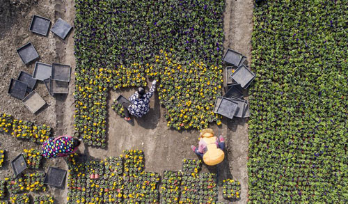 2月25日,在江苏省海安县城东镇观光农业园内,园艺师在管理花卉。近年来,江苏省海安县利用本地自然条件和区位优势,大力发展以花卉种植为主导的“美丽产业”,产品销往上海、山东、安徽、浙江等地。新华社发(徐劲柏 摄)