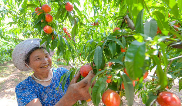 7月3日,邯郸市邯山区富成蔬菜专业合作社的社员在采摘油桃。