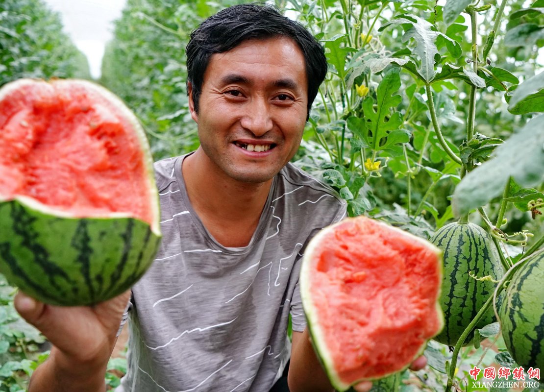 7月25日,张家口市宣化区塔儿村乡西庄子村扶贫“牛奶西瓜”种植合作社的社员在展示刚采摘的“牛奶西瓜”。
