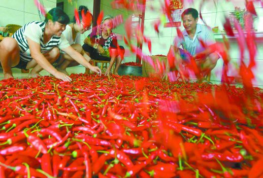 8月1日,新田县陶岭镇富上村,村民在挑选刚采摘的辣椒进行加工。该县“陶岭三味辣椒”属国家地理标志产品。近年来,新田县将辣椒做成带动贫困群众脱贫致富的产业。目前,该镇种植的2000余亩“陶岭三味辣椒”红了,全面进入丰收采摘期,火红的辣椒销售火热,让村民过上了红火的日子。(记者 郭立亮 通讯员 乐国辉 摄影报道)