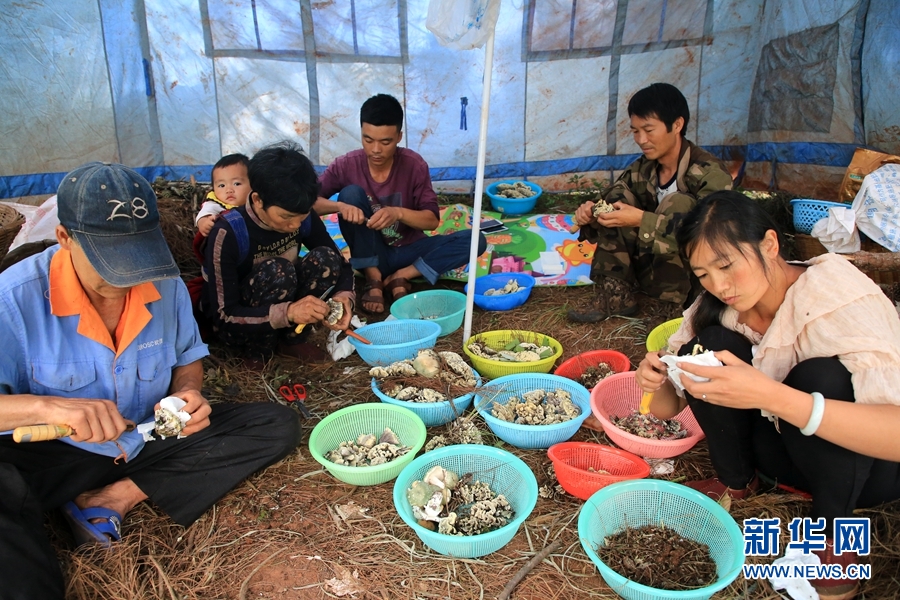 农户在对野生菌做初步的清洁。新华网 周亚平 摄