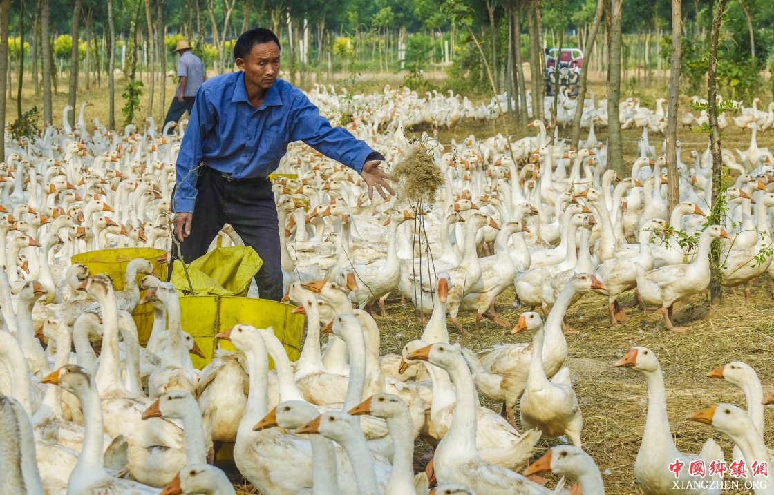 9月10日,河北大城县昌泰苗圃种植农民专业合作社的养殖户在给“大三花”鹅喂食。