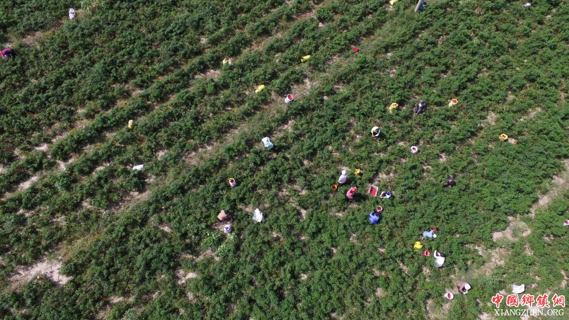 9月16日,阜城县王集乡南张庄村农民在采摘辣椒(无人机拍摄)。