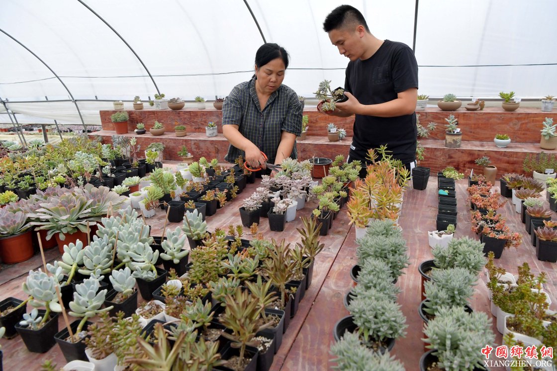 彭荣(右)和工作人员在大棚里查看即将销售的一批多肉植物的生长情况(9月28日摄)。