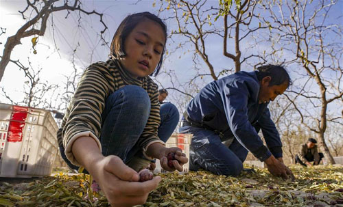 10月20日,在且末县阿热勒镇有机红枣园里,一名小朋友在帮家人捡红枣。