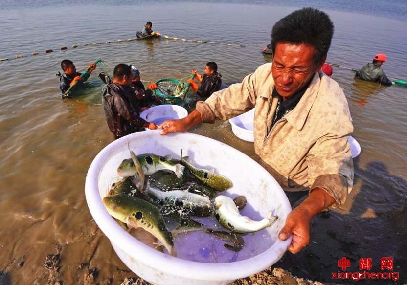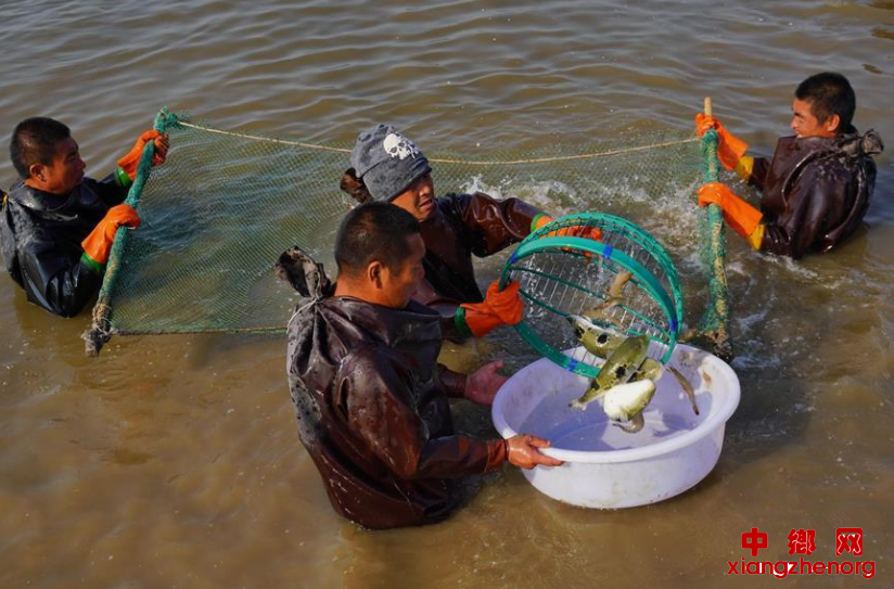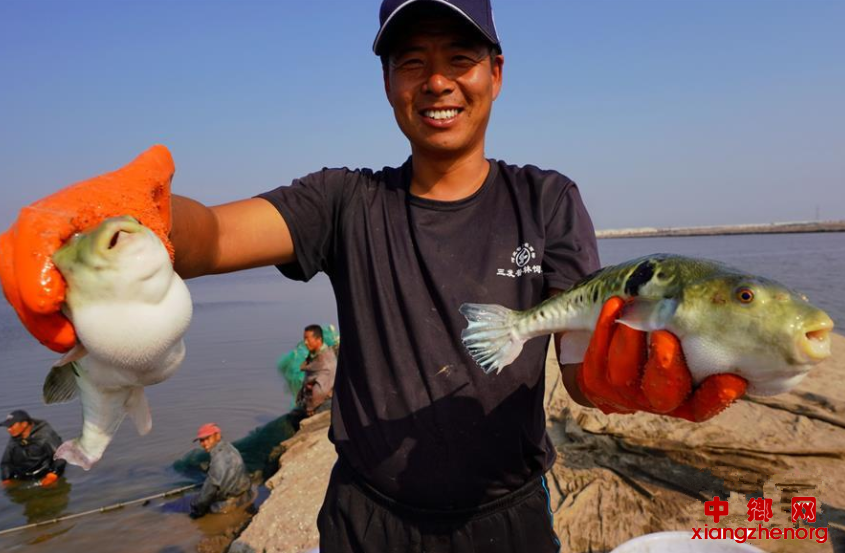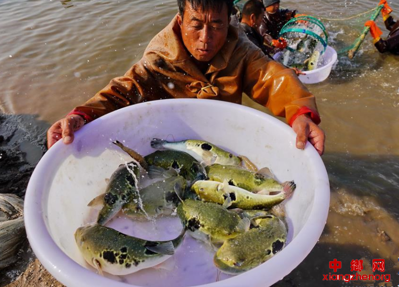 9月26日,唐山市曹妃甸区一家养殖场的工人在捕捞河豚。