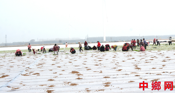 中乡网河南讯 3月8日,河南省内黄县马上乡大黄滩村的娃娃菜小拱棚种植产业基地内,一派繁忙的春耕景象。基地负责人王永正带领着48名钟点工,抢抓农时,有条不紊地进行娃娃菜苗的移栽工作。大家分工协作、配合默契,一株株嫩绿的菜苗被整齐地植入土中,为即将到来的丰收播下希望的种子。